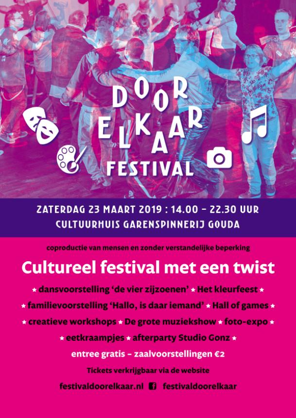 Op 23 maart 2019 is de tweede editie van Festival Door Elkaar. In samenwerking met It's Moving, Dansstudio Gouda, Studiorama, Cultuurhuis Garenspinnerij en Muziekfabriek Rollingsticks worden er vanaf januari 2018 drie fantastische inclusieve culturele producties ontwikkeld in Gouda.